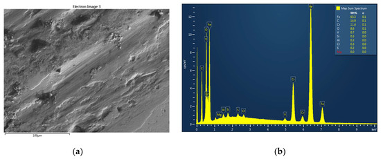 (a) SEM image of a worn surface ball of steel ball: Calcium soap grease; (b) EDX spectrum: Calcium soap grease.