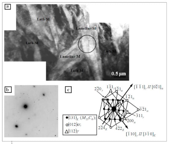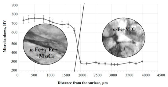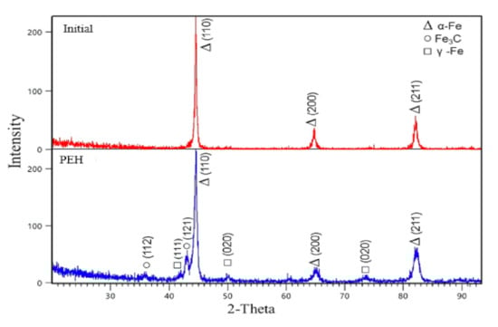 - The PEH leads to the formation of a modified layer consisting of an α′-phase (packet plate martensite), a γ′-phase, small particles of cementite M3C and uniformly arranged in the volume of the M23C6 carbide material;