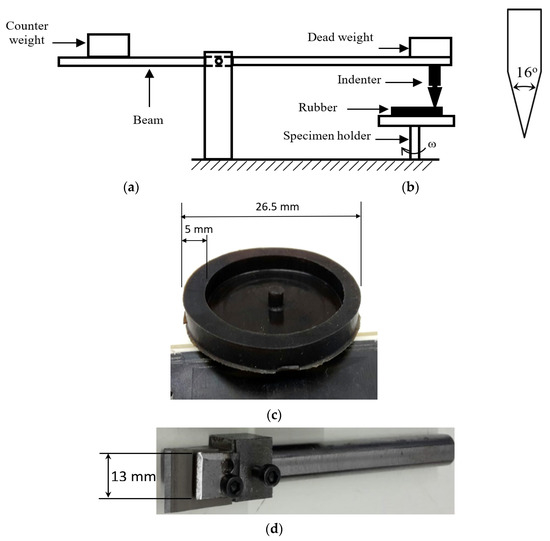 A schematic of the pin-on-disc tribometer and blade indenter used in the current study is presented in Figure 1a,b. It consists of a rotating rubber specimen in contact with an indenter system. The indenter system consists of the blade indenter itself, deadweight, beam, and counterweight. To obtain a good sliding contact, the width of blade indenter is made larger than the contact width. The rubber specimens were prepared as a disc with circular contact width of 5 mm and outside diameter of 26.5 mm. The counter surface used was a straight blade indenter with a specified wedge angle and tip width. In the present study, the sharp blade indenter was made of steel with a wedge angle of 16° and a width of 13 mm. The indenter tip was made as sharp as possible. It was rather difficult to measure the tip radius whose value can vary along the width of the indenter tip. The estimated tip radius value is about 0.5 to 0.8 mm. The photographs of the specimen and blade indenter are depicted in Figure 1c,d.