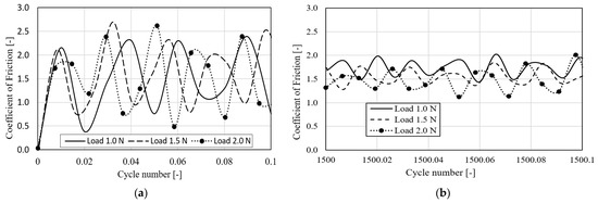 The experimental results of the tribometer tests for the coefficient of friction are given in Figure 2. This is a comparison example of the coefficient of friction data at the beginning of the first cycle (a) and at the beginning of the 1500th cycle (b). Furthermore, the data were taken in a short span of time that around 0.3 s and for only 0.1 of the cycle (around 15 mm length of track). The black dots are the sampling data from measurement which was then connected as a smooth line. It can be observed that the first cycle produces higher fluctuating values for the COF than at the beginning of the 1500th cycle for the different loads, 1.0 N, 1.5 N and 2.0 N.