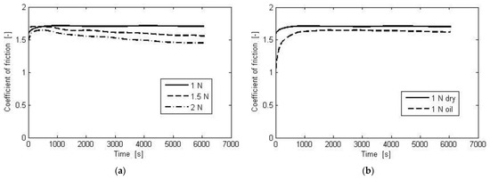 The coefficient of friction (COF) of the point contact from Equation (1) reflects the fact that the whole friction coefficient decreases with the normal load Fn. It can be seen that the rupturing component depends on the normal load Fn, while it does not appear on the sliding component. Hence, for a dry surface, an increase of the normal load causes to decrease and consequently also the overall friction coefficient, as shown in Figure 3a. It can be observed that at the beginning of the sliding time the friction coefficient for a dry surface is not significantly different, as the sliding component is still dominant.
