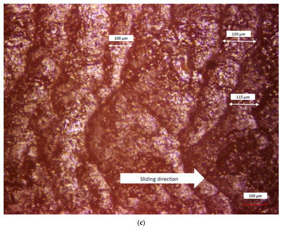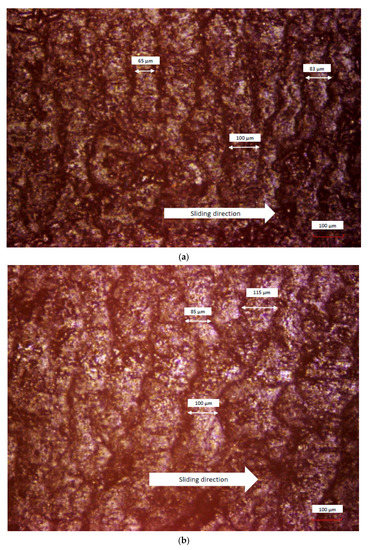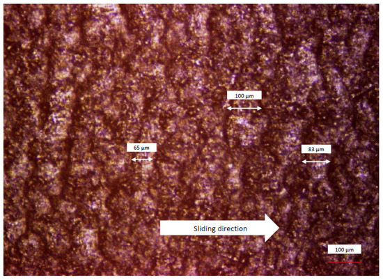 The obtained wear pattern of the abraded rubber on the dry surface can be seen in Figure 4. In general, the length of the wear pattern spacing increases along with the applied loads. Based on these figures, it can be estimated that the spacing length of wear pattern for the applied loads of 1.0 N, 1.5 N and 2.0 N are approximately 65–100 μm, 85–115 μm and 100–130 μm, respectively.