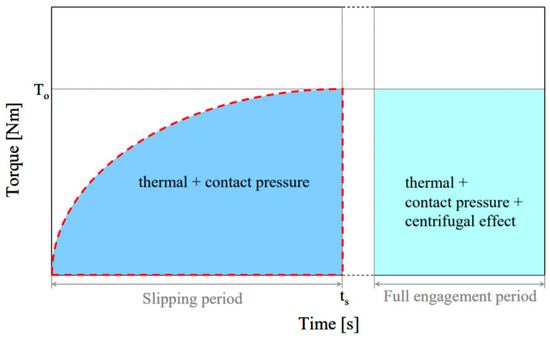 Figure 2 shows the cycle engagement of the clutch system, which consists of two periods. In the first period, an axial force is applied to a pressure plate to produce sufficient compression to trigger the initial engagement. A significant disadvantage of this stage is the high amount of friction heat generation due to the sliding between rubbing surfaces [1]. This period is called the heating period (slipping phase), this is also the phase characterized by the highest values of thermal stresses and interface temperature. Once both the parts of the system (driving and driven) reach the same speed, the heat generation vanishes and the second period starts (lock-up phase).