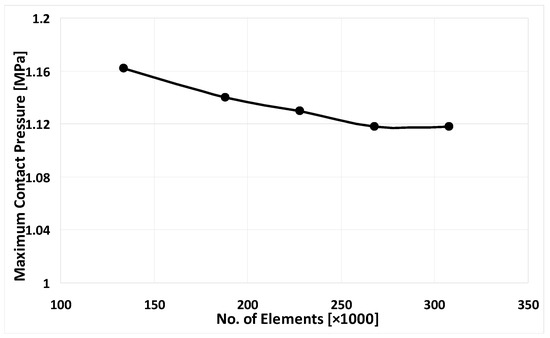 Based on the real dimensions, an accurate three-dimensional model of the main parts of the dry clutch system (pressure plate, clutch disc and flywheel) was developed using SOLIDWORKS 2020. After checking the model and the surfaces of contact, the model was exported to ANSYS/Workbench 2020. Figure 5 shows the optimal finite element model of the friction clutch system. This mesh type was selected after performing the mesh dependency test. The full Newton–Raphson with unsymmetrical matrices of elements was chosen to achieve the numerical solution including the large deflection. For all numerical analyses, the materials are assumed isotropic and homogeneous. Table 1 shows the main characteristics of the materials, dimensions and the operational parameters. The selected type of the frictional material was sintered metal (dry), where the range of maximum pressure was (2–2.75 MPa), the maximum allowable temperature for continuous and instantaneous cases are 622 K and 822 K, and the maximum allowable velocity was 1097.28 m/s [16]. Figure 5 shows the mesh independence test to select the optimal finite element model of the clutch system. The selected FE model had 1,164,367 nodes (268,675 elements).
