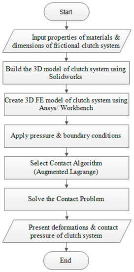 Figure 6 shows the flowchart finite simulation of the solution of the contact problem of clutch system. Figure 7 demonstrations the disassembly of the contacting elements of the clutch system (sector). The types of the element used to build the contact finite element mode of the clutch system can be seen.