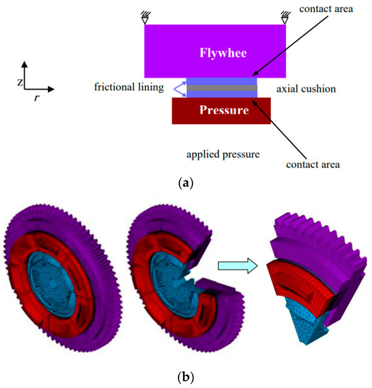 The boundary conditions and finite element model of clutch system (clutch disc, flywheel and pressure plate). (a) the load and boundary conditions of clutch system. (b) 3D FE model of clutch system.