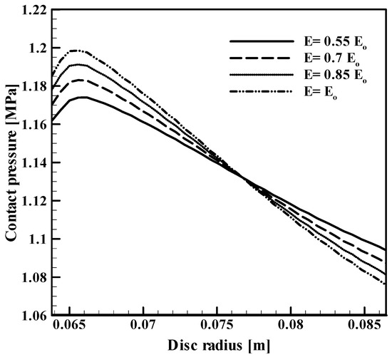 Figure 8 shows the contact pressure distribution along the disc radius between the clutch disc and the pressure plate by using different values of modules of elasticity of frictional materials under the same working conditions. It can be noticed for all the cases that the maximum value occurred near the inner radius (at r = 0.065 m). Behind this point, the values of the contact pressure decreased until reaching the minimum value at the outer radius. The main reason for this distribution of the contact pressure is the restriction conditions and the geometry of the contacting parts of the clutch system. The highest values of contact pressure (1.198 MPa) occurred when the value of modulus of elasticity is highest ().The minimum value of the contact pressure (1.173 MPa) occurred when using the lowest value of modulus of elasticity (). However, all values of the contact pressures for all cases were equal at r = 0.077 m, and the values of contact pressure was (1.13 MPa).
