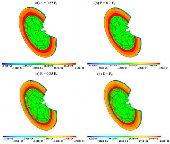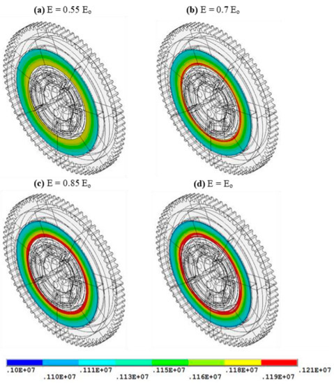 Figure 10 demonstrates the contours of the deformation for the same four cases. It can be observed that the maximum deformation occurred when using the frictional facing with the lowest value of modulus of elasticity (). On the other hand, the minimum values of deformation appeared when using the frictional facing that has the highest value of modulus of elasticity (). In general, the distributions of deformations are semi-uniform over the contacting area for all cases, because of there is a small gradient in the contact pressure without thermal influence. On the other hand, in the case of hot spots, the distributions of displacements will be not uniform any more.