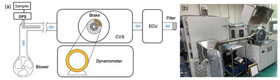 (a) A schematic of brake dynamometer, connected by PM measurement device. Brake assembly is located in a constant volume sampling system, in which the environment is controlled by environment control unit (ECU). Air-inflow is filtered by HEPA filter system. (b) Image of 1/5 scale dynamometer and optical particle sizer system.