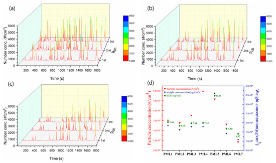 Time variation of particle number concentration for (a) PML-1, (b) PML-2, (c) PML-3, and (d) PML-4.