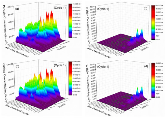 Figure 4 and Figure 5 show the particle number/mass profiles from the PML-2/-4 and PML-5/-6/-7 materials, respectively, from low-speed (1–550 s) to extra-high-speed region (1500–1800 s) under WLTC cycle. The bimodal-shaped mass distributions with a small peak in the sub-micon range (0.3–1.0 μm), and a large peak in the micron range (1.0–10 μm). Fine particle (<1.0 μm) and coarse particle (1.0–10 μm) are majorities in the number and mass patterns, respectively. However, even though the number concentration of fine particle was much higher than that of coarse particle, the mass concentration (μg/cm3) of fine particle should be smaller than that of coarse particle because of smaller volume. See Figures S1–S7 for all the cycles.