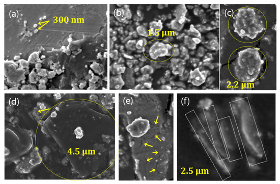In this work, 5 morphological categories of wear debris were found in FE-SEM images (Figure 6). Secondary granular particles (Figure 6b,c) consist of smaller primary particulate matter (Figure 6a), which tends to aggregate/agglomerate for the purpose of minimization of surface energy. The primary particle size measured from the SEM images in Figure 6a is approximately submicron size (<1 μm), whereas secondary granular particles have a size of micrometers (Figure 6b). See Figure S8 for the EDX result for Figure 6a–c. Large steel lump with irregular shape (Figure 6d) was found to be pure Fe according to EDX analysis (Figure 7a), which is probably separated from grey iron disc by fragmentation without considerable chemical oxidation. The large micron-sized particles, (1) in Figure 7a, are made by mechanical wear, not by oxidative wear [28]. Whereas, submicron particles, (Figure 6a–c) are formed by the evaporation-condensation process and the aggregation of the nano-sized particles. See Figure S9 for the EDX results for Figure 7b.