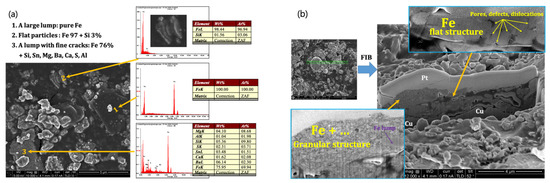 (a) FE-SEM image of large lumps (1), flat particles (2), a lump with fine cracks (3), showing their constituting elements, (b) microstructure of flat particles (2), showing Fe lumps granules, pores, defects, dislocations.
