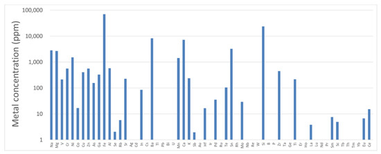 The lumps with fine cracks (Figure 6e/(3) in Figure 7a) and flat particles(Figure 6f/(2) in Figure 7a) might be created by the combination of chemical oxidation/aggregation and abrasive mechanisms between grey iron disc and pads, which can be deduced from EDX and SEM data(Figure 7). In contrast to Fe lump (1), the particles in Figure 6e,f and (2,3) of Figure 7a, include granular particles, of which chemical elements are common in pads, along with small Fe lumps. According to previous work, when organic matters in pads oxidize at high temperature, numerous pitting occurs in the interface between pad and disc, thereby resulting in material removal [28]. The smaller fraction, in this work, appears to be aggregated with Fe lumps, resulting in larger flat (2) and plate-shaped particles (3). Thus, the micron-sized PM, ranging from micrometers to tens of micrometers, seems to be, in part, originated from the aggregates of smaller primary particles with Fe lump as a core. ICP analysis of wear debris sample, randomly collected from filter in the dynamomter, is given in Figure 8. Main element is Fe and detected elements are Na, Mg, Ni, Ba, Ca, Mn, Sn, Si (>1000 ppm); V, Cr, Cu, Zn, As, Ga, Al, Sr, K, Te, Zr, Ti (>100 ppm).