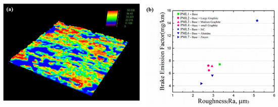 (a) Typical 3D surface profile in worn surface, (b) relationship between mass-based PM emission factor with respect to surface roughness of worn pad.