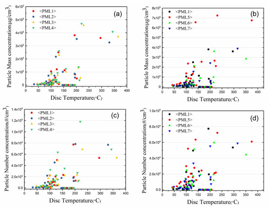 (a) Particle mass concentration (b) particle number concentration for PML-1/-2/-3/-4, (c) particle mass concentration (d) particle number concentration for PML-1/-5/-6/-7 with respect to disc temperature during dynamometric tests.