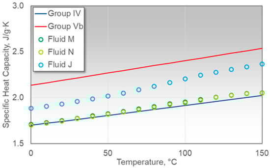 - The blue line represents a Group IV base fluid grade used in both Fluid M and N, combined with a higher and lower viscosity grade, respectively, to achieve the desired viscosity profile. Within the viscosity ranges discussed here, differences in the heat capacities of finished and base fluids are more or less within test precision.