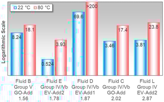 The contribution of a fluid’s components and their interactions to the fluid’s electric properties are quite complex. As an example, some electric conductivities according to ASTM D2624 [] are shown in Figure 7 below.