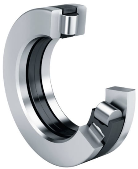 Rolling bearing performance was a major focus of the mechanical testing. Classical testing under boundary friction conditions via DIN 51819-3 [] was complemented with a high-speed mixed friction test on the Schaeffler FE8 test rig with cylindrical roller thrust bearings (CRTB, see Figure 8 below), and a fatigue lifetime test with needle bearings (NKI 40/20, see Figure 9 below) at full fluid film conditions.