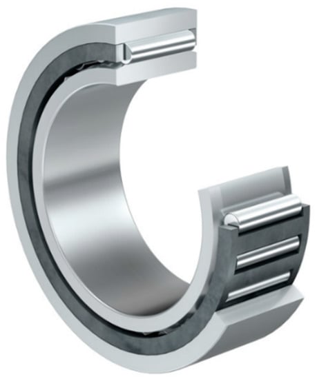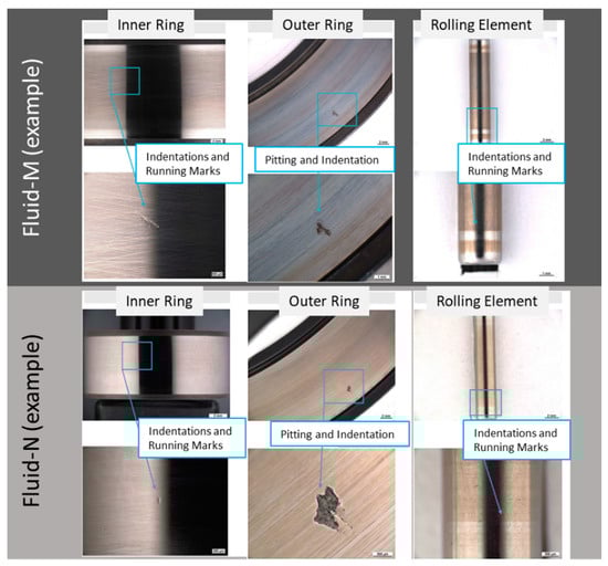 Due to the high contact loads in the CRTB under the FE8-25 test conditions, the test is very harsh, with high requirements for the anti-wear properties of the lubricants. According to experience, other bearing types (i.e., deep groove ball bearings “DGBB”) are less wear-critical at this test stage. To determine the effects of low viscous fluids, the pitting test was run with needle bearings. The test conditions and specimen are listed in Table 6. The NKI 40/20 in this test is a radial-loaded bearing. The failure mode in the test was material fatigue—see Figure 12.