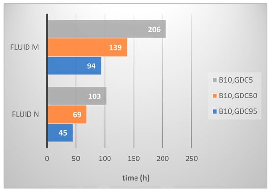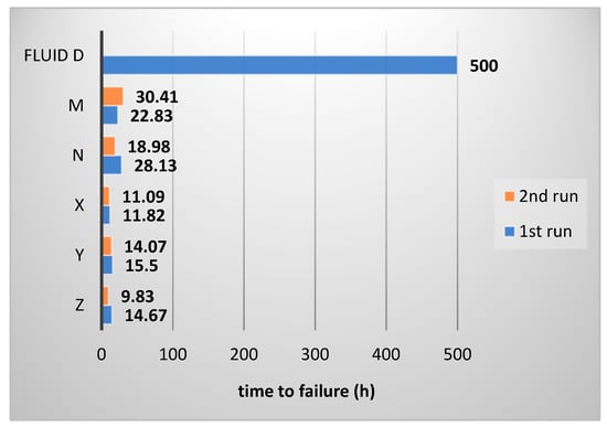 Pitting is a form of surface-near material fatigue, which is the prime failure mechanism for gears and rolling bearings, limiting their service life. The FZG pitting test is widely used to assess the gear pitting resistance of a fluid. Gears of defined geometry are run under predefined conditions of load, speed, and temperature until pitting occurs. Due to time limitations, only some selected fluids based on the same additive packages have been run in this test—the results are shown in the following Figure 2.