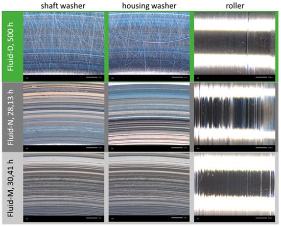 The results are shown in Figure 10. The reference oil Fluid D shows an acceptable performance. This is also visible in the pictures of the raceways after the test (Figure 11). At all bearing raceways from tests with a LV formulation, high wear is visible after short running times. The wear marks removed the original surface structure completely. In contrast to this, the addition of the reference oil is able to protect the bearings’ surface against wear. The pictures show the original bearing surface structure, with finishing marks still clearly visible.