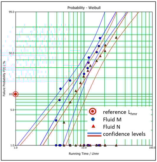 Figure 13 provides the statistical results of the test runs, with Fluids N and M shown. The test runs with the “thinner” Fluid N, as expected, results in a shorter time to failure. In Figure 14, the comparative calculated bearing lifetime (Lhmr) via a Weibull distribution is displayed. The figure shows clearly that both oils lead to nearly the same “viscosity corrected” bearing lifetime. The real fatigue lifetime is approx. four times higher than calculated. Moreover, all statistical values are bigger than the calculated reference fatigue lifetime. This clearly indicates that satisfactory durability would be possible with these ULV fluids.