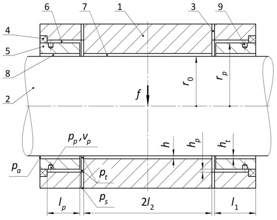 The bearing operates as follows. The gas lubricant supplied under pressure ps, having overcome the hydraulic resistance of the channels 3, enters a thin lubricating gap 6 and bearing lubricating clearances 7 and 8 under pressure pt, and then flows out of the bearing. The hydraulic forces created by the pressure on the surface of the rings 5 are balanced by the elastic material deformation resistance of the elastic rings 4. The integral reaction of the pressure forces on the rings 5 in the gaps 6 is always greater than the corresponding reaction from the gaps 8, as can be seen by the analysis of the corresponding pressure distribution diagrams. For this reason, during the bearing’s operation, the rings 5 will make a movement that is opposite to the external force vector f, creating an obstacle to the outflow of lubricant from the bearing, therefore increasing the hydraulic force acting on the shaft displaced under the load and reducing the bearing compliance.