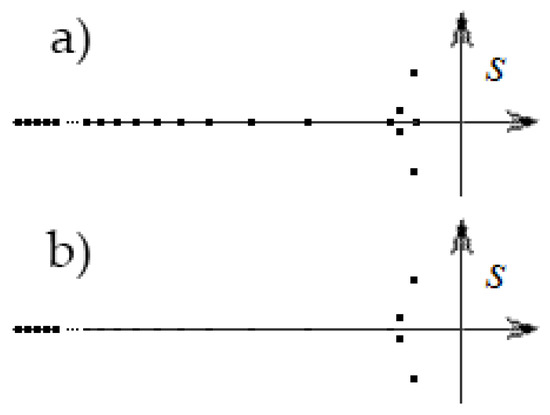 The calculations showed that an acceptable relative error of 0.1% in the calculation of the criteria for the n number divisions of the integration segments in the c, t, p areas is ensured for n ≥ 8. Moreover, the order of CP . Therefore, for n = 8 the order is m = 52, for n = 16 the order is m = 108, etc., i.e., it can be in the tens or even hundreds. Figure 2 shows the location of CP zeros, where the abscissa axis corresponds to their real parts, and the ordinate axis corresponds to the imaginary parts. An analysis of the CP zeros arrangement showed that for the most part they are negative real numbers, and they are located at a great distance from the imaginary axis on the plane of the complex variable s values. Moreover, only 3–5 zeros are located near the imaginary axis, including zero with the largest real part, which determines the value of the criterion (Figure 2a).