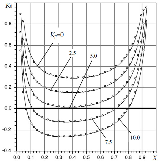 Figure 3 shows graphs of the bearing static compliance K0. It can be seen that for the indicated set of parameter values, zero and negative compliance K0 ≤ 0 takes place with the rings 4 material compliance Kp > 5 in the range of an adjusting coefficient 0.2 < χ < 0.6.