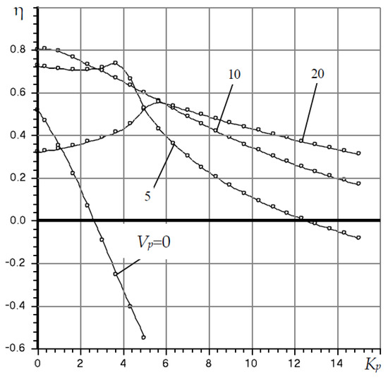 Dependences of the stability degree η on the elastic rings’ compliance Kp and volume Vp at Ps = 4, χ = 0.5, L = 1.5, L1 = 0.3, Lp = 0.25, Rm = 1.2, Hp0 = 1; σ = 2.5.