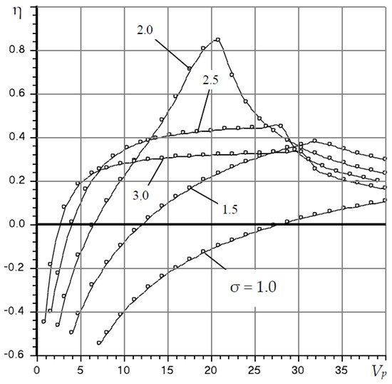 In addition to the parameter Vp, another important parameter, which affects only the quality of the bearing dynamics, is the “compression number” σ. Figure 5 shows the curves of the stability degree on these parameters. Function η(Vp, σ) is extreme, i.e., on the graph of this function there is a point that corresponds to the maximum speed of the bearing. For the given in Figure 5 parameters extremum of criterion η = 0.91 takes place at Vp = 24.6; σ = 2.1.
