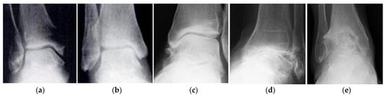 Stages of development of ankle osteoarthritis: (a) zero (no changes); (b) the first; (c) the second; (d) third; (e) fourth (the complete obliteration of the joint). Adopted from [].