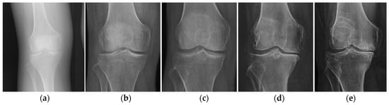 Stages of development of osteoarthritis of the knee joint according to Kellgren and Lawrence: (a) zero (no changes); (b) the first; (c) the second; (d) third; (e) fourth (severe osteoarthritis). Adopted from [].