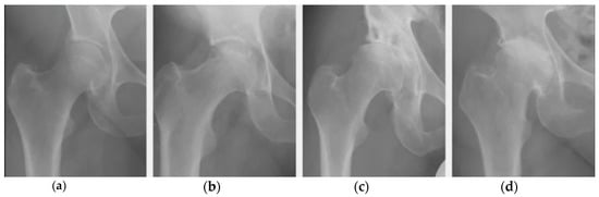 Stages of development of osteoarthritis of the hip joint: (a) zero (no changes); (b) the first; (c) the second; (d) third (maximum disappearance of cartilaginous tissue from the joint surfaces). Adopted from [].