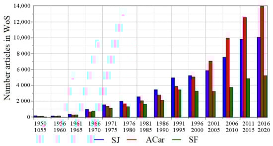 Dynamics of publications on topics synovial joints (SJ), articular cartilage (ACar) and synovial fluid from 1950 to 2020 (according to Web of Science data).
