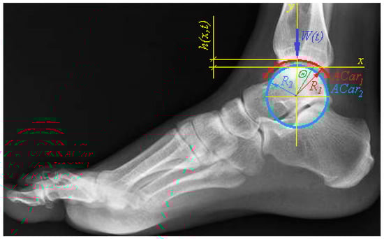 Indeed, if we consider the movements of the elements of the synovial joint only in the sagittal plane, then its model in the first approximation can be represented by two rigid infinite cylinders covered with a porous elastic material and separated by a layer of liquid that can penetrate into the pores. So, for example, the model of the ankle joint is presented as a movable joint of the talus and tibia, the surfaces of which, being in internal contact with each other, are close to cylindrical with radii ( (talus) and  (tibia) and are covered with thin layers of poro-elastic articular cartilage the same thickness (). In this case, the talus, which can be conventionally considered motionless, perceives the action of an external load  applied to the tibia (Figure 6).
