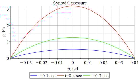 It should be noted that in recent years it has become practically the norm to represent synovial fluid as a non-Newtonian fluid, since the results of solving most problems become more plausible even with significant simplifications of other elements and parameters of lubrication models [,,,,,]. The only problem that arises in this case is a certain complication of the mathematical side of the problem. However, with modern software, this problem becomes insignificant.