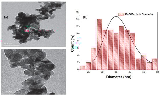 Figure 1. (a) (TEM) micrographs of CuO nanoparticles, (b) Size distribution of CuO nanoparticles.