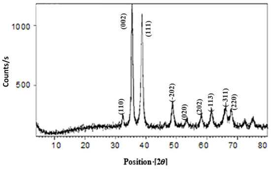 Figure 2 shows the XRD pattern of the Copper oxide nanoparticles. In this pattern, most of the diffraction peaks are indexed to the cupric oxide (CuO). This indicates that nanoparticles are CuO only without any additives. Mainly, Copper Oxide could be found in two phases as Cu 2 O   (Cuprous Oxide) and CuO (Cupric oxide), depending on the valence state of the copper [47]. The peak resulted from the XRD pattern has an angulation 2θ ranges from 35.7 to 38.5, represented by (002) and (111) crystallographic planes, respectively. This is the same as reported in the literature for CuO (Cupric oxide) nanoparticles with no existence of any impurities or other peaks corresponding to Cu 2 O or Cu ( OH ) 2 phases [32,48,49,50]. The peaks of 32.6, 49, 53.6, 61.7, 66.2, and 68.4 are represented by crystallographic planes of (110), (−202), (020), (−113), (−311), (220) respectively. These results are consistent with the standardized copper oxide nanopowder peaks, as mentioned in [51]. These resulted diffraction sharp peaks indicate a pure monoclinic CuO copper oxide nanopowder.