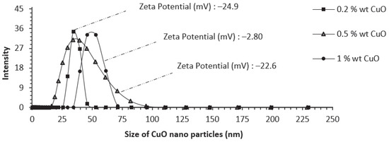 The general criteria of Zeta potential value that determine the system’s stability are approaching +25 mV or −25 mV [34,40]. This is to say that this suspension system is considered to be stable. Moreover, OA-treated CuO nanoparticles were analyzed using Fourier transform infrared spectrometry (FTIR-BRUKER-A225/Q, Multiple Crystals CRY). This is to present the functional group in OA/CuO treatment and to justify the results of XRD for the purity of CuO nanopowder.