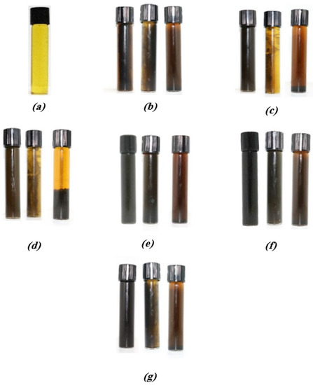 Figure 5. Photographs of sedimentation analysis of CuO nano lubricant. (a) Base lubricant, (b) 0.2 wt.% CuO, (c) 0.5 wt.% CuO, (d) 1 wt.% CuO, (e) 0.2 wt.% CuO + OA, (f) 0.5 wt.% CuO + OA, and (g) 1 wt.% CuO + OA.