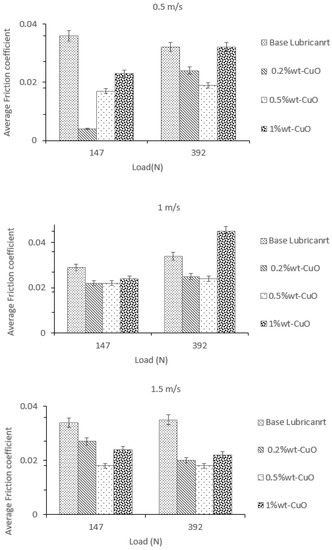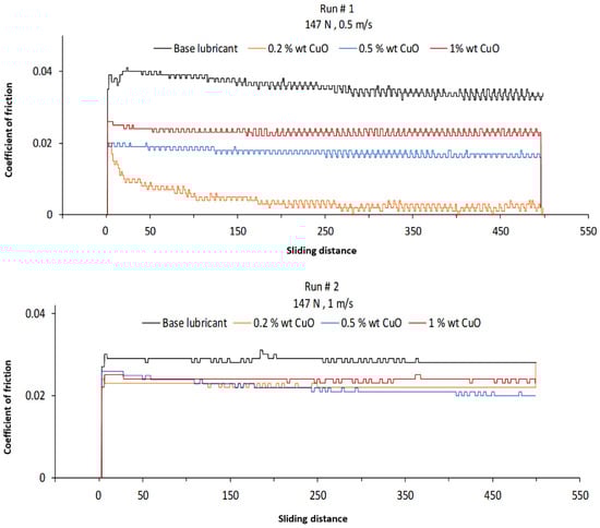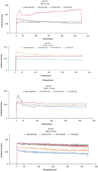 Figure 6 and Figure 7 show the coefficient of friction (COF) as well as the average COF under different working conditions of the contact loads (147 N, 392 N) and sliding speeds (0.5, 1, 1.5 m/s). From the first glance of friction results, the highest COF value would be observed at the onset of each test. This comes back to the static friction (static COF) that must be overcome at the beginning of the sliding motion between any two surfaces. Other fluctuations in COF along the rest of the sliding distance are according to the dynamic COF, which accounted for the energy required to shear the adhered peaks of surface asperities during the relative motion of surfaces. All CuO nano lubricant concentrations show a considerable COF reduction under most testing conditions concerning the base lubricant. At run # 1, with a contact load of 147 N and a sliding speed of 0.5 m/s (206 rpm), there is a clear trend of reduction in COF for all CuO concentrations concerning the reference lubricant. However, some CuO concentrations failed to enhance the lubrication process and, on the contrary, increase the COF as in runs 3, 4, and 5 for 0.2 and 1 wt.% CuO. It can be figured out that raising load and sliding speed simultaneously increases the COF for the base lubricant. This verifies that the test is undergoing boundary and mixed lubrication regimes. This is considered a regular phenomenon at these lubrication regimes where the high normal load would squeeze the lubricant. The film thickness of lubricant will be smaller than the average surface roughness of sliding surfaces, and then higher contact at the micro peaks of asperities is expected. This would also increase the shear strength and plastic deformation of asperity peaks at the surface of contact, raising the coefficient of friction.