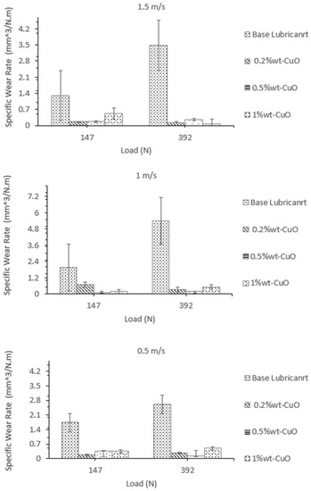Moreover, the lubricating oil would be unable to separate the asperities of contacts effectively. Hence, the wear rate of frictional surfaces starts to grow. This is remarkable at the specific wear rate (Figure 8). The specific wear rate is increasing with load and sliding speed simultaneously in the case of base lubricant. The reason is also related to the high normal load with a sliding speed, which prevents the production of a sufficient thick lubricant film from separating the peaks of asperities at the contact area. Hence, a higher rate of asperities deformation is attainted. For CuO nano lubricant, lower COF and specific wear rate are observed at the same conditions (higher load and sliding speed). This means that the nano lubricants system works correctly at these lubrication regimes to boost the tribological properties of base lubricants. This is correlated to less time for contact at asperities, which leads to minimal time for asperities distortion. Thus, the entire contact area at frictional surfaces decreases, causing a decline in the COF and wear rate. It is observed that, at the lowest normal load and sliding speed of 0.5 m/s−147 N, nano lubricant with 0.2 wt.% achieved the lowest COF and wear rate. This is because, at this condition, the film thickness is sufficient to separate the two frictional surfaces slightly; consequently, a low rate of asperities contact is obtained. For 0.5 wt.% nano lubricant, a convenient, low COF, and wear rate are discerned under most of the testing conditions of load and sliding speed in contrast with the base lubricant.