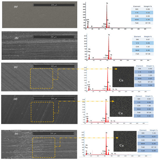 Figure 9. (SEM) micrograph with (EDX) analysis (a) bare sample, (b) Run # 6 (392 N- 0.5 m/s) Base Lubricant, (c) Run # 6 (392 N- 0.5 m/s) 0.2 wt.% CuO, (d) Run # 6 (392 N- 0.5 m/s) 0.5 wt.% CuO, (e) Run # 6 (392 N- 0.5 m/s) 1 wt.% CuO.