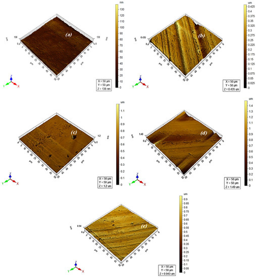 Figure 10. 3D surface topography of AFM (a) bare sample, (b) Run # 6 (392 N- 0.5 m/s) Base Lubricant, (c) Run # 6 (392 N- 0.5 m/s) 0.2 wt.% CuO, (d) Run # 6 (392 N- 0.5 m/s) 0.5 wt.% CuO, (e) Run # 6 (392 N- 0.5 m/s) 1 wt.% CuO.