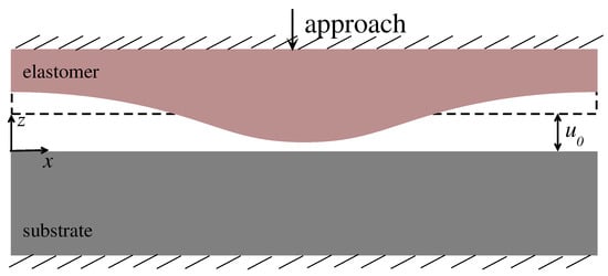 We consider an adhesive, flat, linearly elastic, semi-infinite elastomer interacting with a rigid indenter. The center-of-mass of the elastomer’s bottom surface, , is gradually decreased from a large positive value, clearly exceeding the characteristic length of attraction, to a value, where elastomer and indenter repel each other and then increased again back to its original value. The internal degrees of freedom, as denoted by in real space or by its Fourier transform , are allowed to take arbitrary values except for the center-of-mass mode , see Figure 1. The elastic energy to deform the (surface of the) elastomer is given by