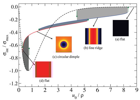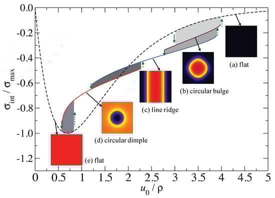 Figure 2 shows the stress-displacement relation for a contact described by the two dimensionless numbers and along with patterns—as defined by the topography of the elastomer’s surface—that arise as stable or metastable solutions. At very large separation, ideally flat surfaces are stable as shown in the inset (a) of Figure 2. When approaching the indenter, the flat configuration becomes suddenly unstable, and a circular bulge, see inset (b), is formed. Upon further reduction of the mean gap, the bulge turns into a line ridge, depicted in inset (c). Next, the ridge develops into a dimple, as shown in inset (d). Finally, the elastomer’s surface flattens out again at close approach as revealed in inset (e).