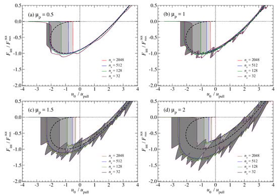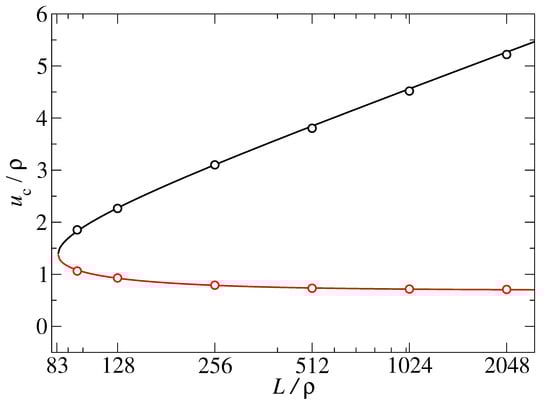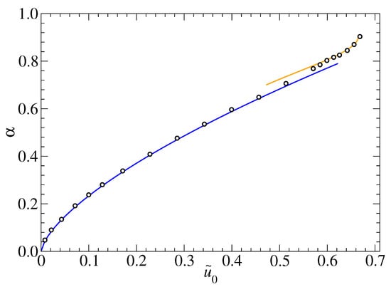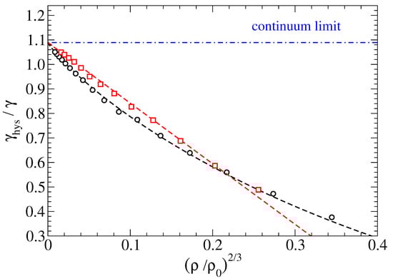 The most important missing ingredient to identify the stress-displacement relation summarized in Equation (19) is the determination of the dimensionless function . For its numerical determination, we proceeded as follows: For a given defect pattern and a given fixed value of , contact points were defined and constrained to a zero displacement. The energy is minimized with respect to the unconstrained displacement field under a given external pressure . In the last step, and are determined from . This was done for different discretizations, which allowed us to perform a Richardson extrapolation of the two observables of interest to the continuum limit for each value of .