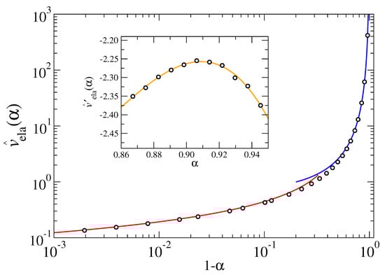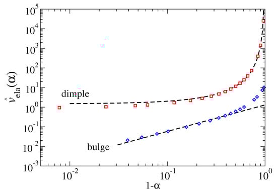 In order to obtain a more precise estimate for the asymptotic thin-ridge behavior before the instability to flattening, GFMD calculations of the reduced elastic energy were refined in the vicinity of . The following results were deduced, which allow that “critical behavior” to be characterized: , , , and . Thus, near the flattening transition, Equation (17) reads